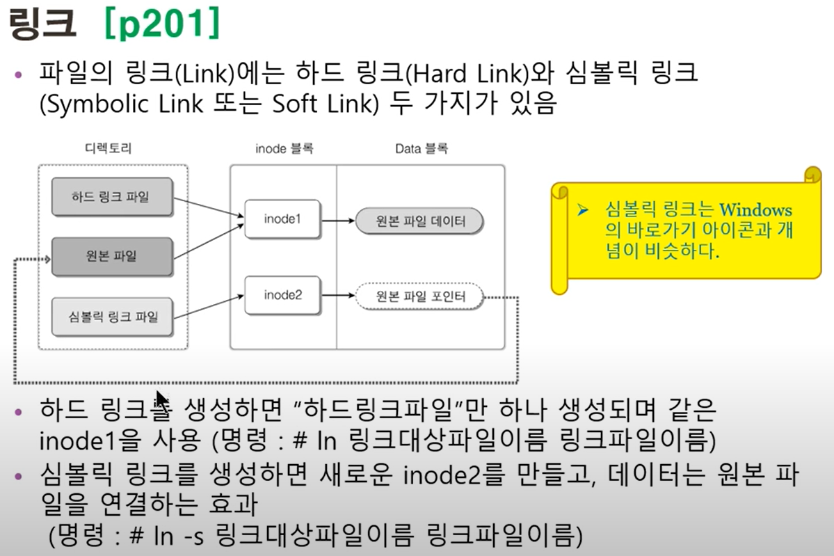 하드링크는 일반적으로 많이 쓰진 않고, 심볼릭 링크를 많이 쓴다. 여기서 링크 파일이란, 원본 파일로 연결시켜주는 파일 즉, 바로가기라고 생각하면 된다.