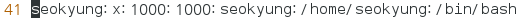 passwd를 열어보니, 1번은 root user가 있고, 마지막 줄에는 seokyung이 적혀 있다. x: 1000(a) : 1000(b)은 seokyung 계정의 id가 1000(a)인 걸 의미한다. 이 사용자의 그룹이 1000(b)인 걸 의미한다. 그 뒤는 home dir, 마지막은 사용 shell이다.