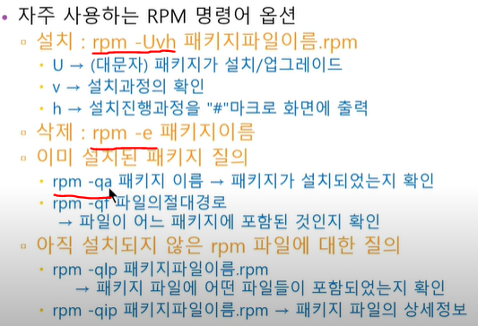 패키지를 설치할 때, A를 받기 위해 B가 필요한 경우(의존성이 필요한 경우) rpm의 한계가 분명하기 때문에 yum이 등장했다. yum install, remove, update, localinstall rpm파일이름.rpm* 를 활용